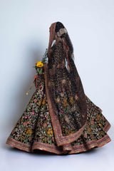FahadHussayn presents a breathtaking black Lehnga Choli embellished with colorful different-sized crystals. It is adorned with very fine hand and zari work paired with an equally phenomenal dupatta.