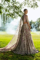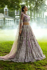 A stunning purple lehenga choli adorned with intricate dabka, naqshi, pearls, and Swarovski crystals, creating a radiant bridal look. The net lehenga features a delicate spray of thread and sequins, adding a soft shimmer to every step.