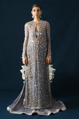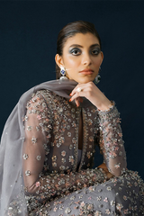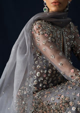 This grey epitome of grace is completely hand embellished. Featuring a key-hole neckline. Three dimensional floral embellishments donned with silver pipes, sequin, stones tastefully blended with grey and pink sequin and stone work. Paired with crushed silk sharara with embellished borders. Completing the look with sequin sprayed organza dupatta.